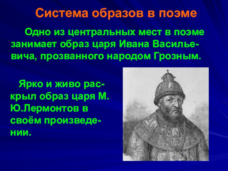 в поэме занимает образ царя Ивана Василье-вича, прозванного народом Грозным.