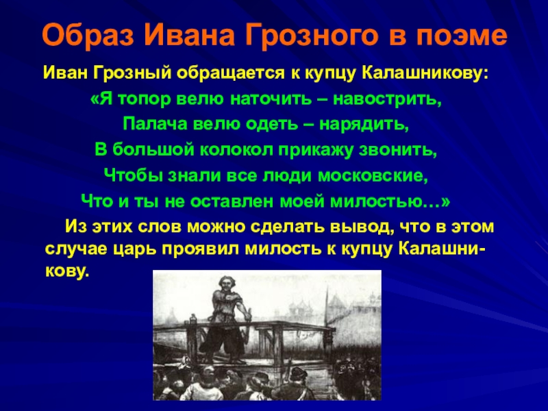 никогда на Руси не звонил большой колокол. Грозный царь звоном боль-шого колокола ставит народ в известность о том, что купец Калашников – не преступник, хотя царь и вы-нужден его казнить. По законам того времени, мы можем понять и «милость» грозного царя: наточенный - навострённый топор не станет причиной мучений купца при казни, палач не выйдет на помост в одежде, испачканной кровью, как при казни преступника. И будет звонить большой колокол. Это всё, что царь может сделать для купца Калашникова в этой ситуации, поскольку сама казнь неизбежна.