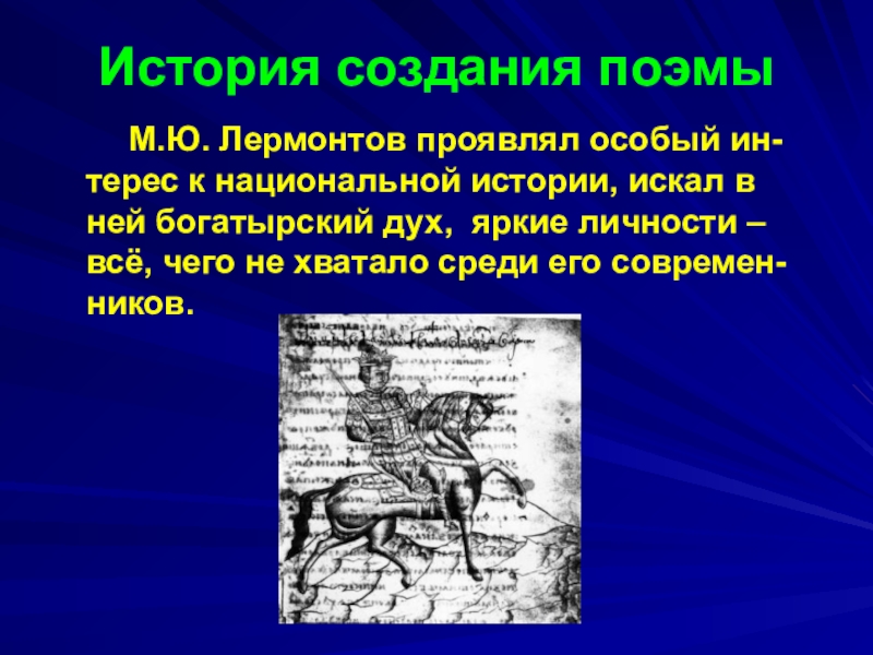 народную поэзию. В 1830 году он записал в своей тетради: «Если захочу вдаться в поэзию народную, то, верно, нигде больше не буду её искать, как в русских песнях». Лермонтов знакомится с русской стариной, народными поверьями и песнями. В нём зарождается мысль создать произведение, в котором выразилась бы жизнь в знаменательный период москов-ской истории – царствование Ивана Грозного.