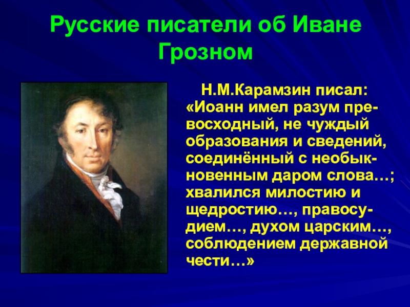 и народных песнях раскры-вался образ царя Ивана Грозного, не только истори-ки писали о нём, но и рус-ские писатели обращались к этой теме, силой своего воображения восстановив-шие для нас 16 век.