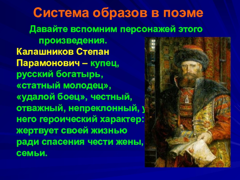 – купец, русский богатырь, «статный молодец», «удалой боец», честный, отважный, непреклонный, у него героический характер: жертвует своей жизнью ради спасения чести жены, семьи.