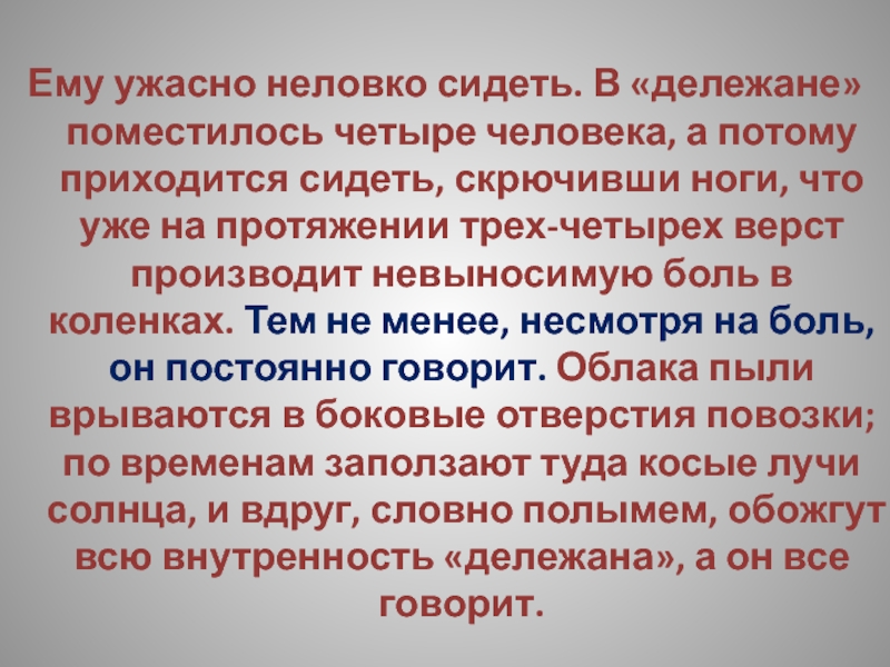 приходится сидеть, скрючивши ноги, что уже на протяжении трех-четырех верст производит невыносимую боль в коленках. Тем не менее, несмотря на боль, он постоянно говорит. Облака пыли врываются в боковые отверстия повозки; по временам заползают туда косые лучи солнца, и вдруг, словно полымем, обожгут всю внутренность «дележана», а он все говорит.