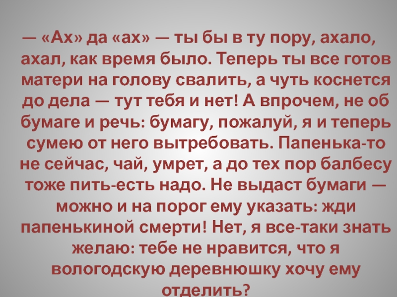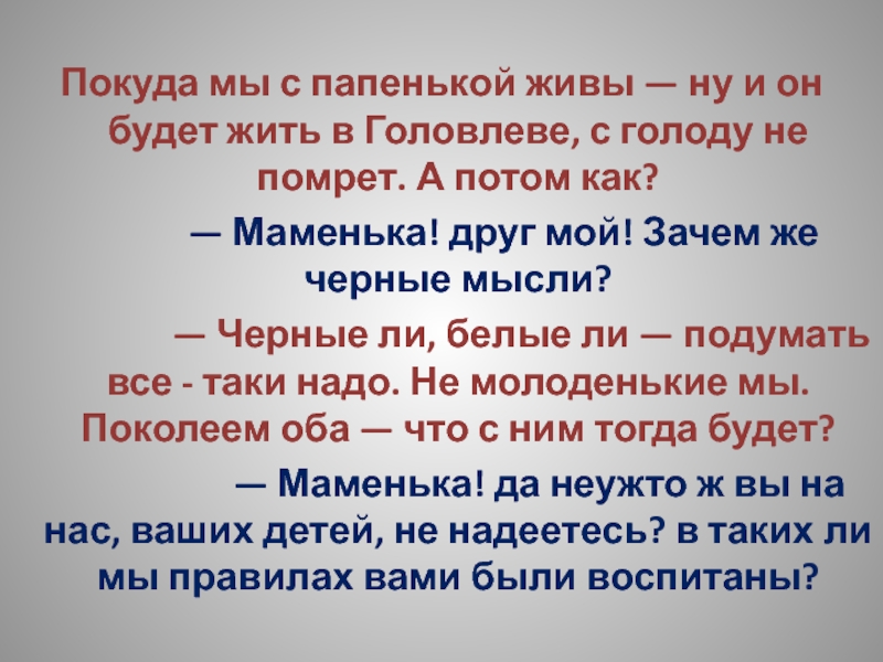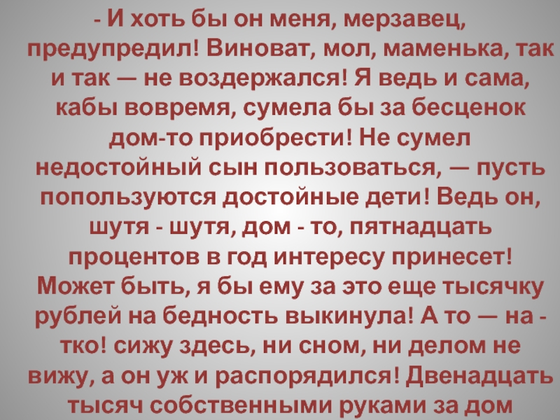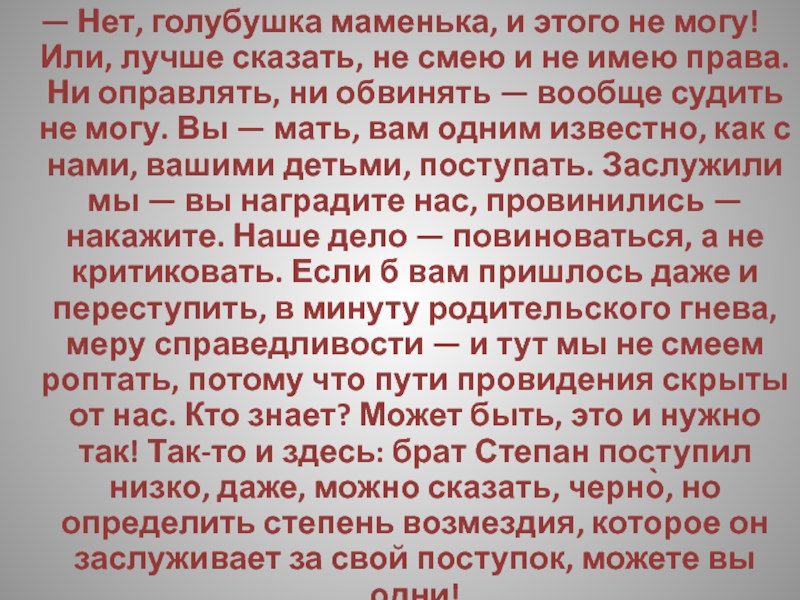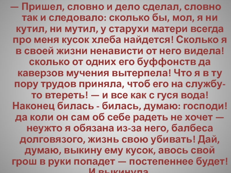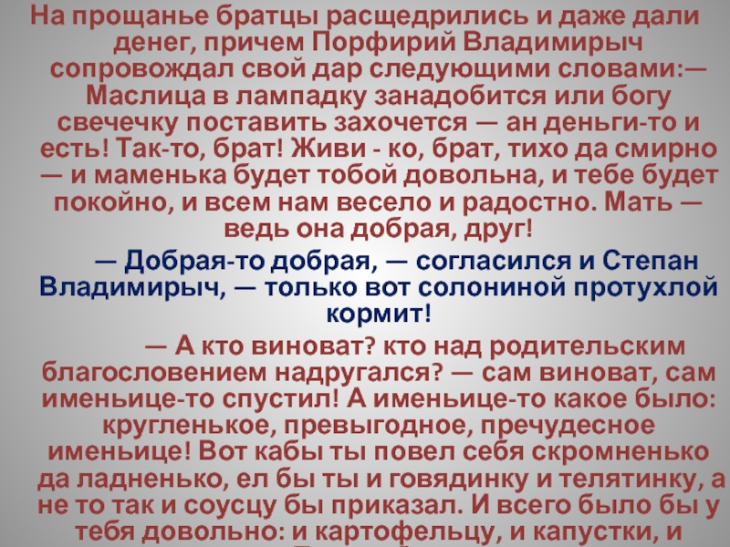 — А ежели ты чем недоволен был — кушанья, может быть, недостало, или из белья там, — разве не мог ты матери откровенно объяснить? Маменька, мол, душенька, прикажите печеночки или там ватрушечки изготовить — неужто мать в куске-то отказала бы тебе? Или вот хоть бы и винца — ну, захотелось тебе винца, ну, и Христос с тобой! Рюмка, две рюмки — неужто матери жалко? А то на - тко: у раба попросить не стыдно, а матери слово молвить тяжело!