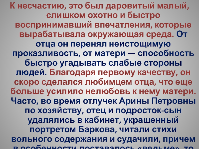 впечатления, которые вырабатывала окружающая среда. От отца он перенял неистощимую проказливость, от матери — способность быстро угадывать слабые стороны людей. Благодаря первому качеству, он скоро сделался любимцем отца, что еще больше усилило нелюбовь к нему матери. Часто, во время отлучек Арины Петровны по хозяйству, отец и подросток-сын удалялись в кабинет, украшенный портретом Баркова, читали стихи вольного содержания и судачили, причем в особенности доставалось «ведьме», то есть Арине Петровне.