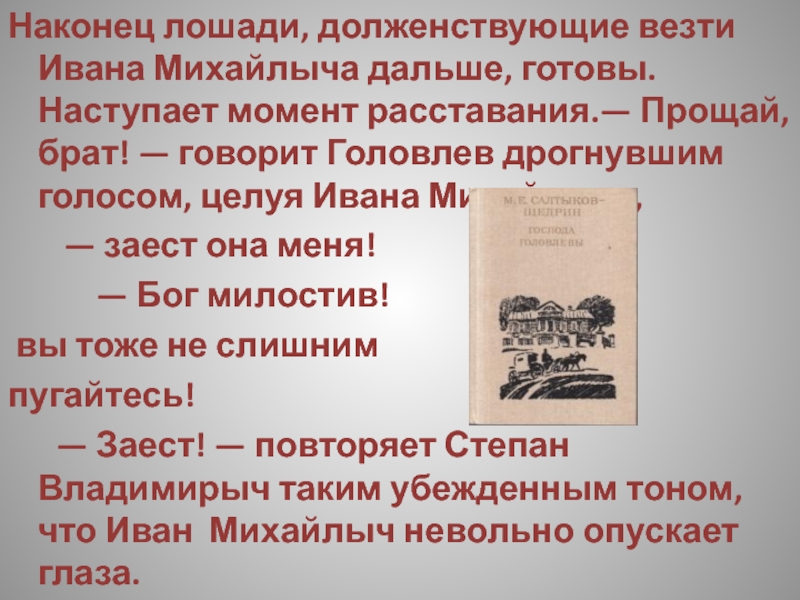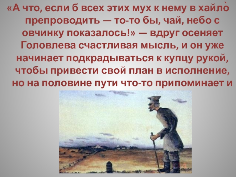 препроводить — то-то бы, чай, небо с овчинку показалось!» — вдруг осеняет Головлева счастливая мысль, и он уже начинает подкрадываться к купцу рукой, чтобы привести свой план в исполнение, но на половине пути что-то припоминает и останавливается.