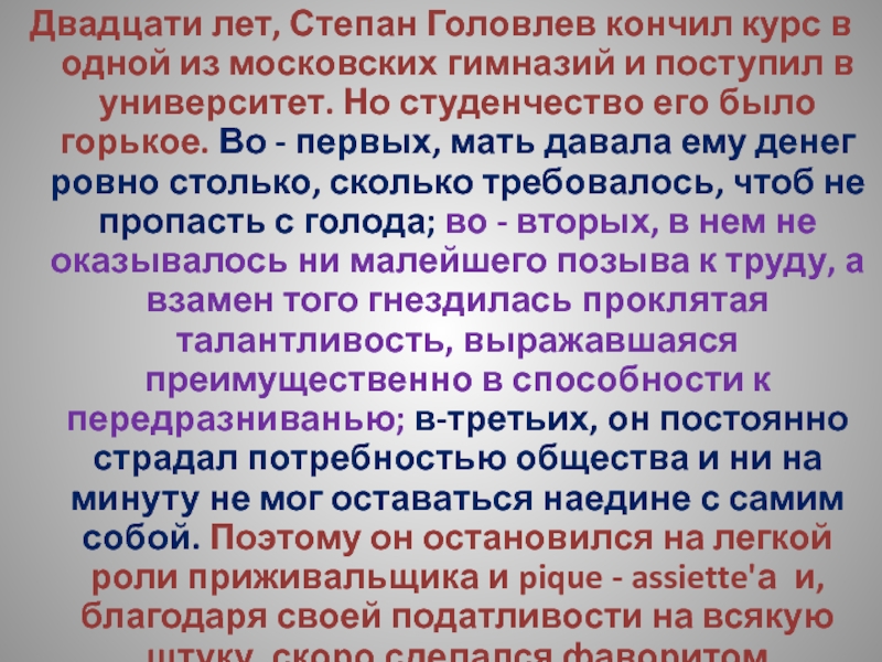 Слайд 13Двадцати лет, Степан Головлев кончил курс в одной из московских гимназий