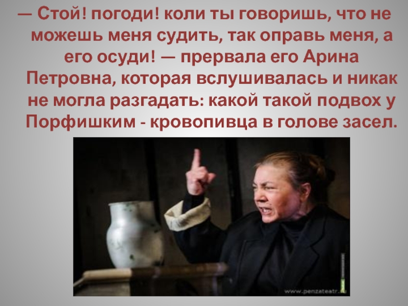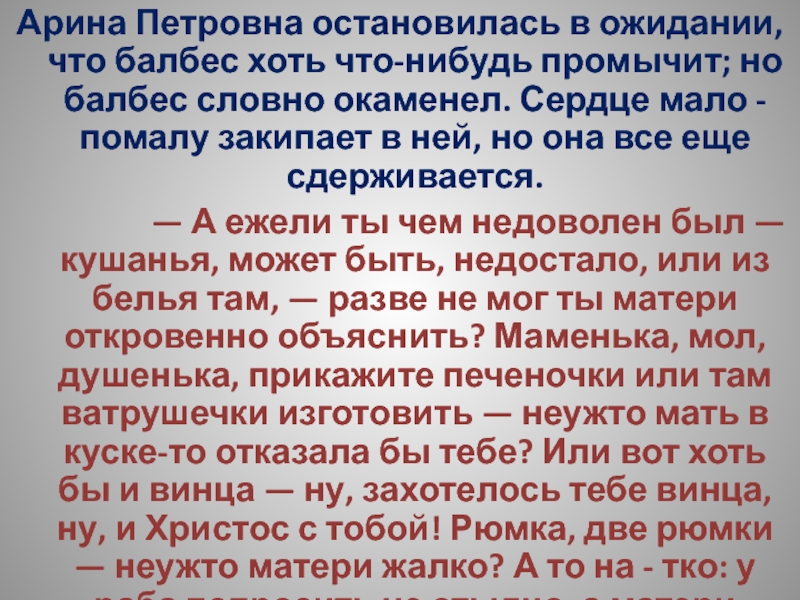 Слайд 216Арина Петровна остановилась в ожидании, что балбес хоть что-нибудь промычит; но