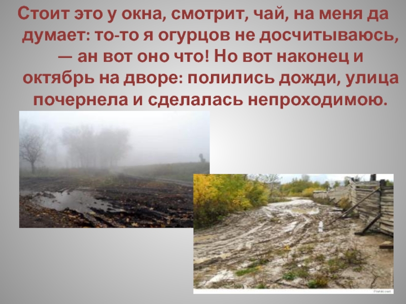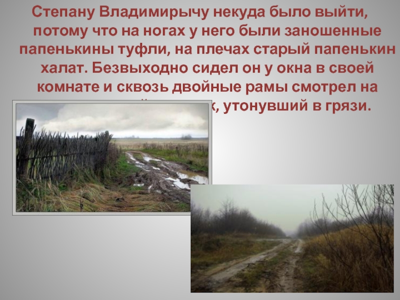 дворе стоял уж ноябрь в начале, но осень в этот год была особенно продолжительна, и морозы еще не наступали. И дорога и поля — все стояло черное, размокшее, невылазное. Как он прошел? куда? И тут же ей вспомнилось, что на нем ничего не было, кроме халата да туфлей, из которых одна была найдена под окном, и что всю прошлую ночь, как на грех, не переставаючи шел дождь.
