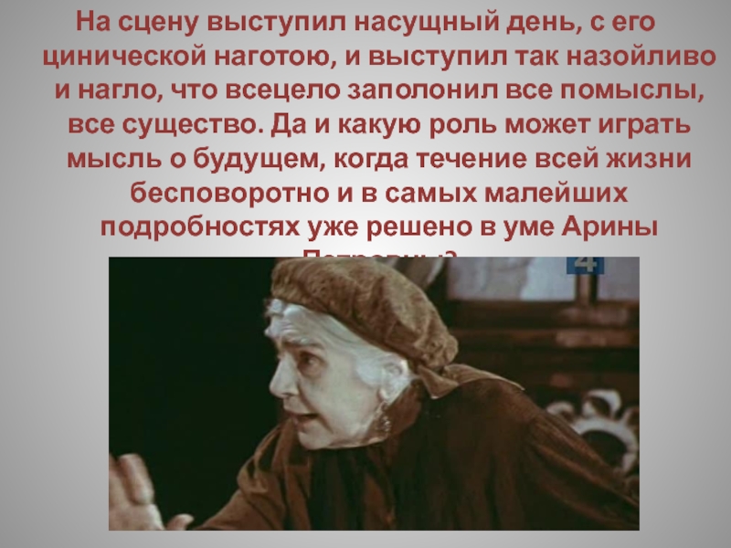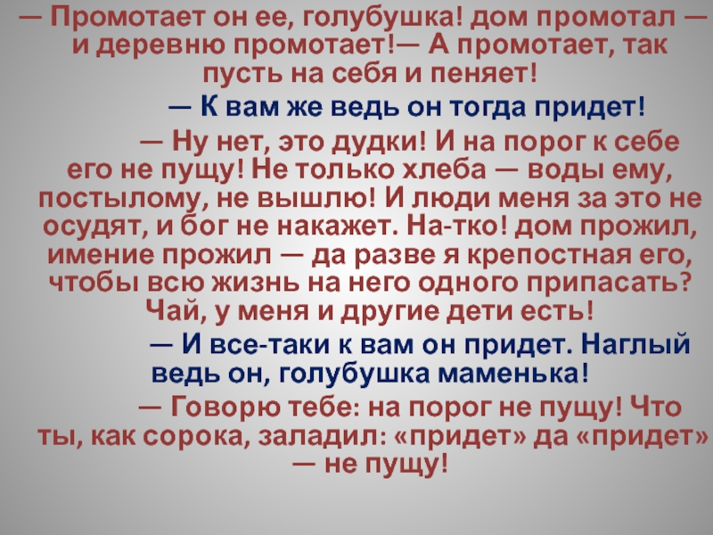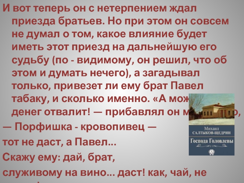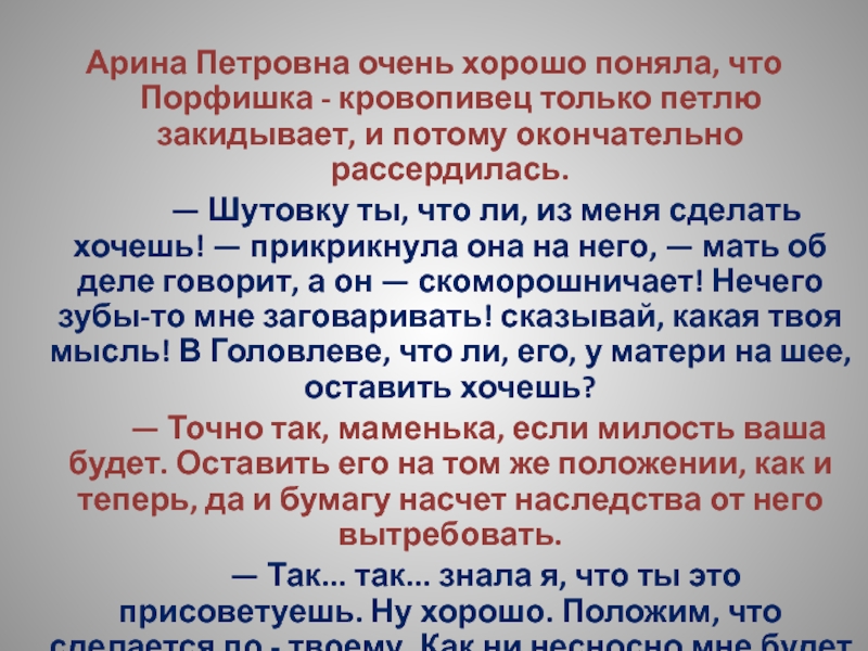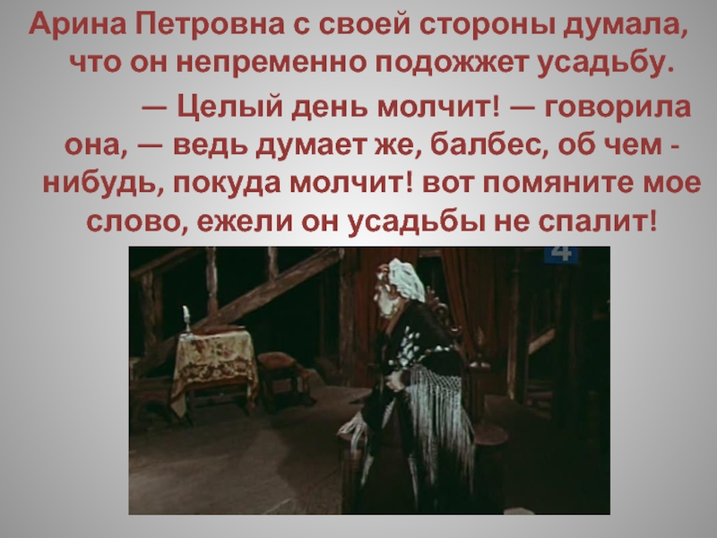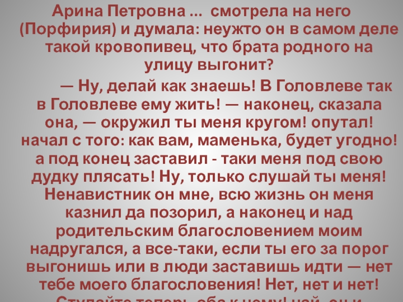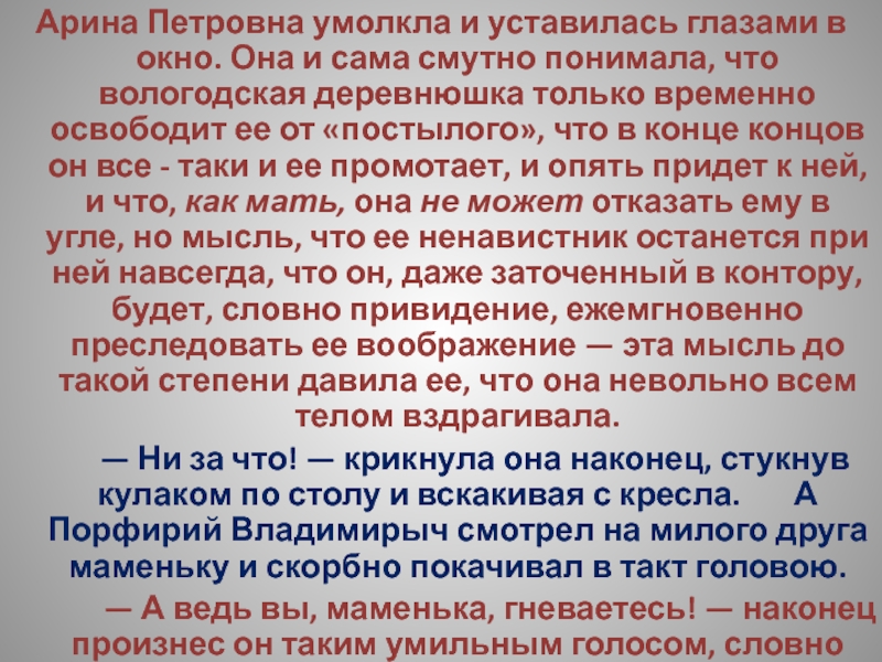 Слайд 221Арина Петровна с своей стороны думала, что он непременно подожжет усадьбу.