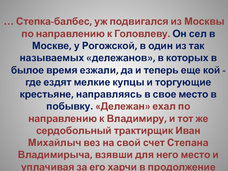 сел в Москве, у Рогожской, в один из так называемых «дележанов», в которых в былое время езжали, да и теперь еще кой - где ездят мелкие купцы и торгующие крестьяне, направляясь в свое место в побывку. «Дележан» ехал по направлению к Владимиру, и тот же сердобольный трактирщик Иван Михайлыч вез на свой счет Степана Владимирыча, взявши для него место и уплачивая за его харчи в продолжение всей дороги.