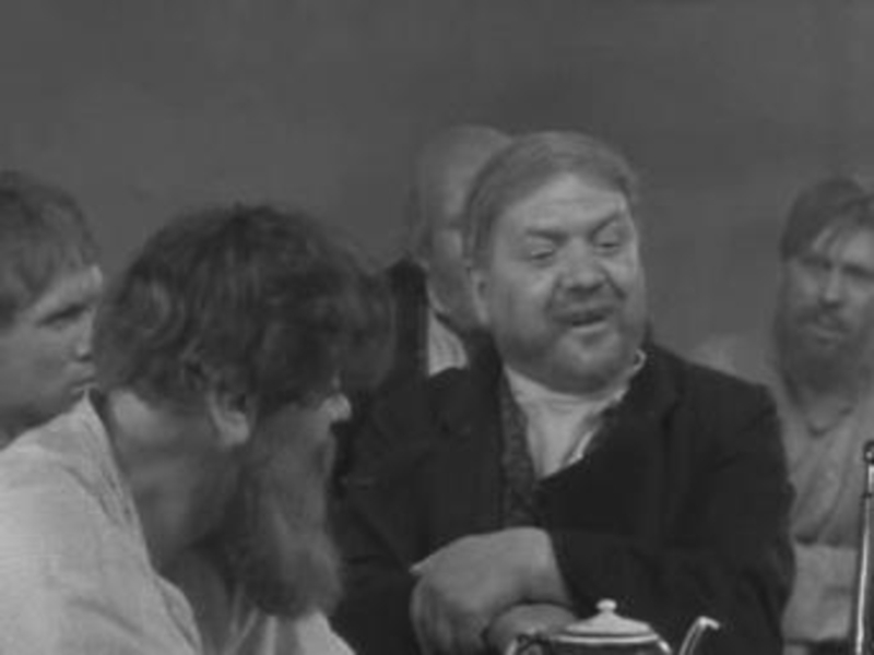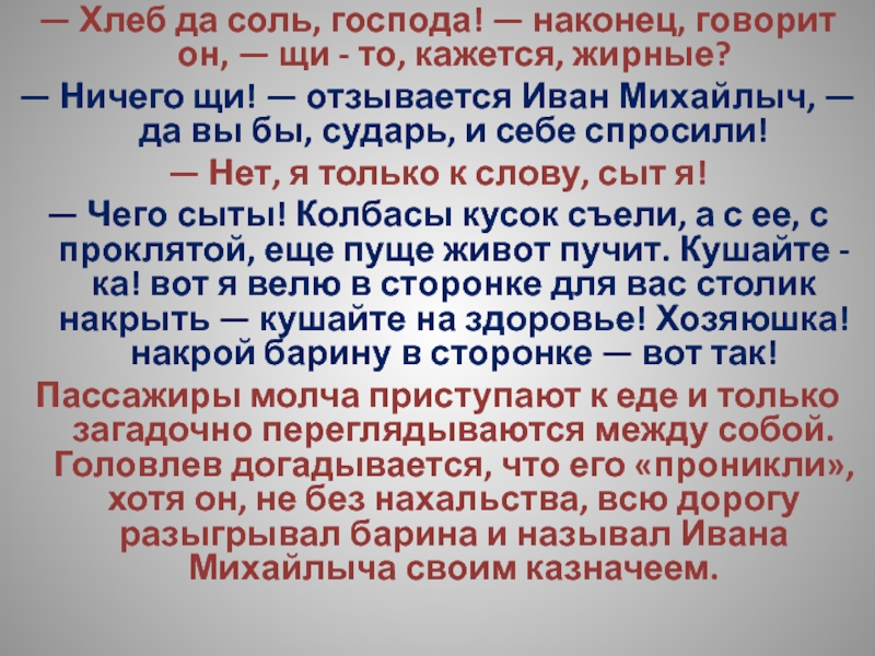 Пассажиры молча приступают к еде и только загадочно переглядываются между собой. Головлев догадывается, что его «проникли», хотя он, не без нахальства, всю дорогу разыгрывал барина и называл Ивана Михайлыча своим казначеем.