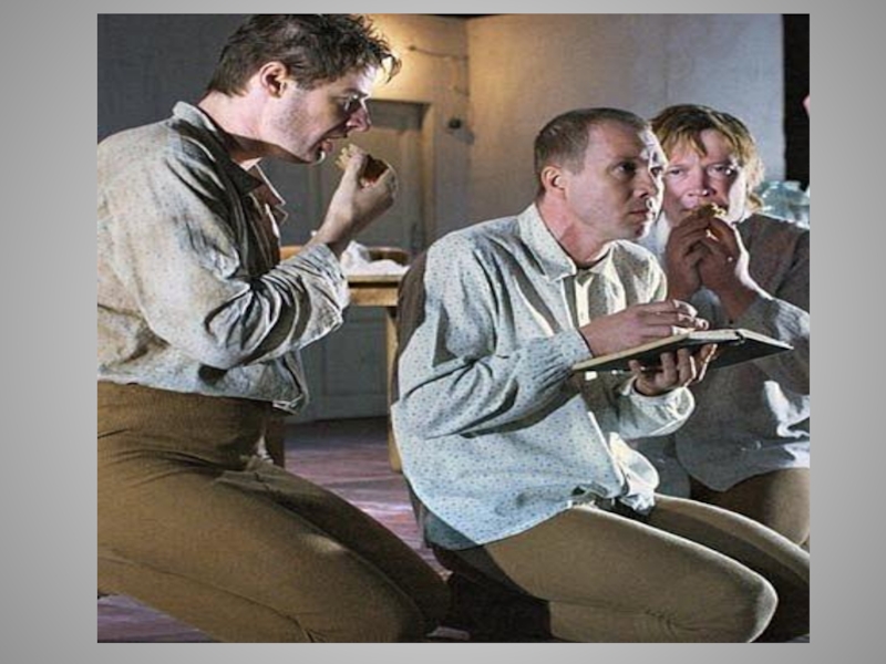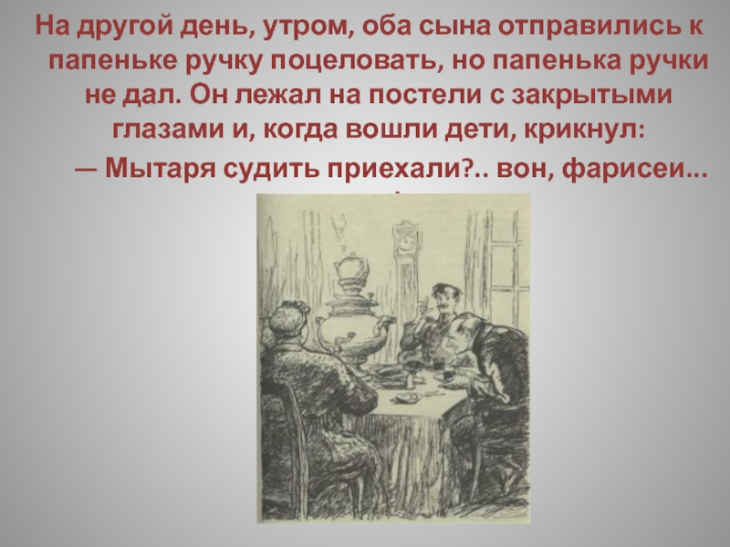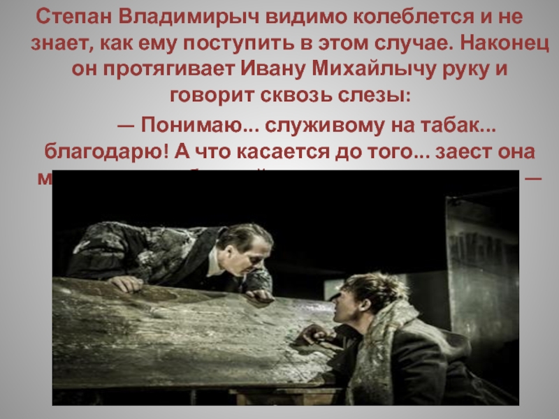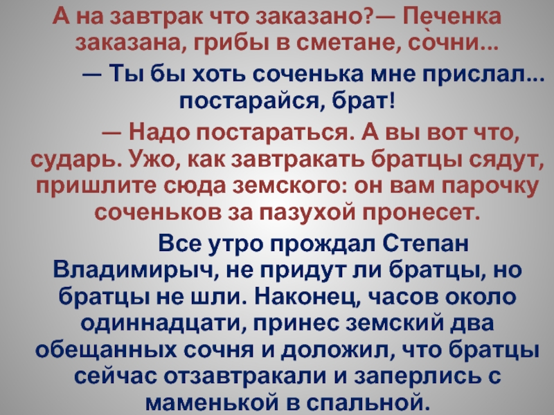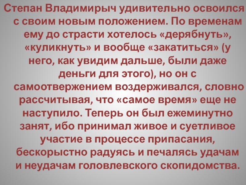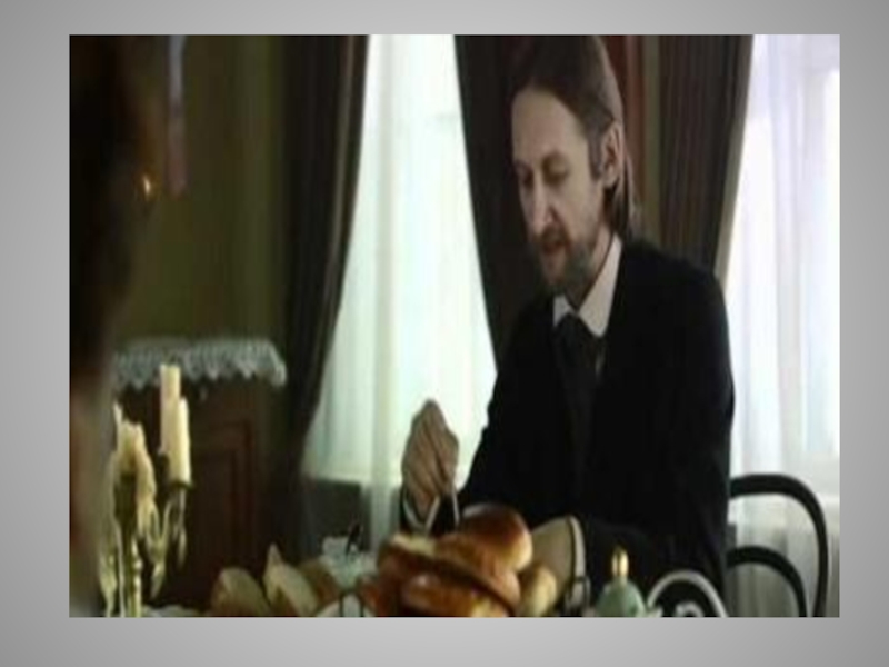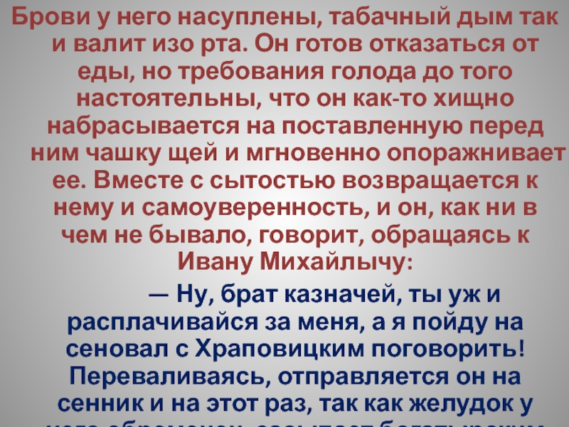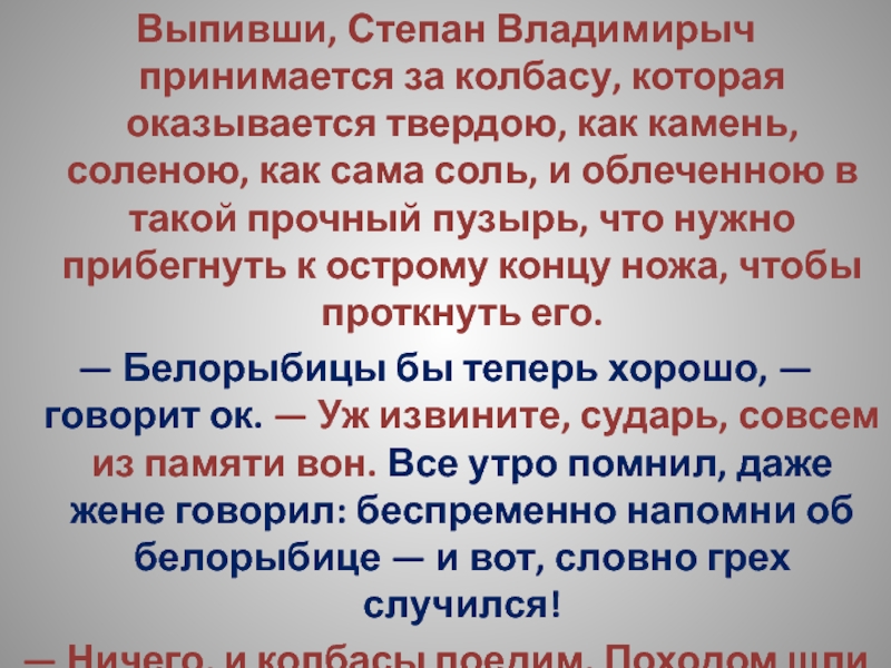Слайд 52Выпивши, Степан Владимирыч принимается за колбасу, которая оказывается твердою, как камень,