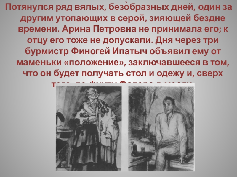 по-прежнему, не отпускала для него свечей. Несколько раз просил он через бурмистра, чтоб прислали ему сапоги и полушубок, но получил ответ, что сапогов для него не припасено, а вот наступят заморозки, то будут ему выданы валенки. Очевидно, Арина Петровна намеревалась буквально выполнить свою программу: содержать постылого в такой мере, чтоб он только не умер с голоду.