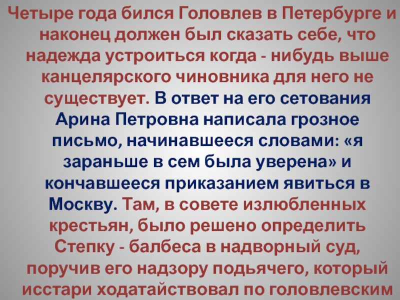 Слайд 19Четыре года бился Головлев в Петербурге и наконец должен был сказать