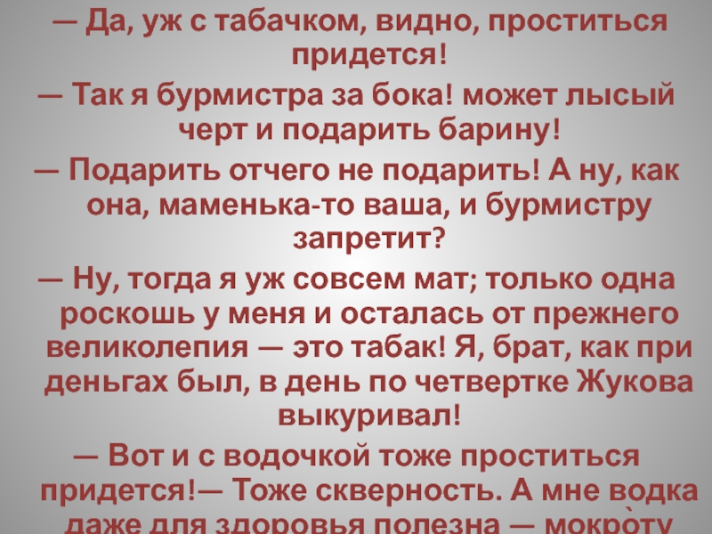 — Ну, тогда я уж совсем мат; только одна роскошь у меня и осталась от прежнего великолепия — это табак! Я, брат, как при деньгах был, в день по четвертке Жукова выкуривал!