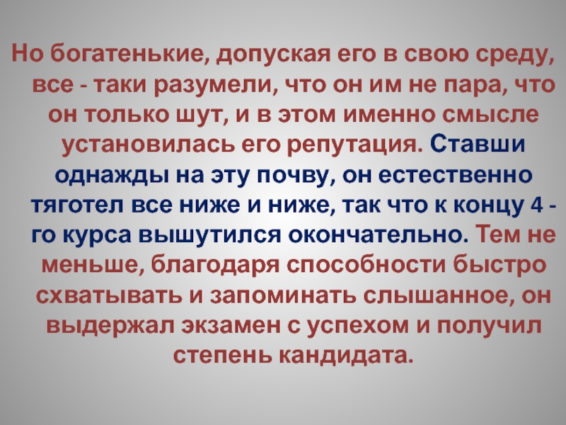что он им не пара, что он только шут, и в этом именно смысле установилась его репутация. Ставши однажды на эту почву, он естественно тяготел все ниже и ниже, так что к концу 4 -го курса вышутился окончательно. Тем не меньше, благодаря способности быстро схватывать и запоминать слышанное, он выдержал экзамен с успехом и получил степень кандидата.