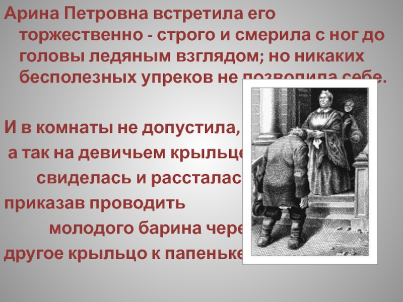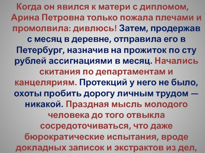 Слайд 17Когда он явился к матери с дипломом, Арина Петровна только пожала