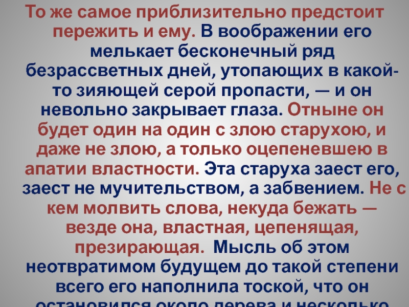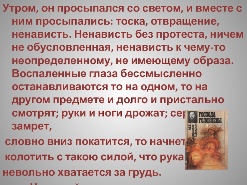 Слайд 189Утром, он просыпался со светом, и вместе с ним просыпались: тоска,
