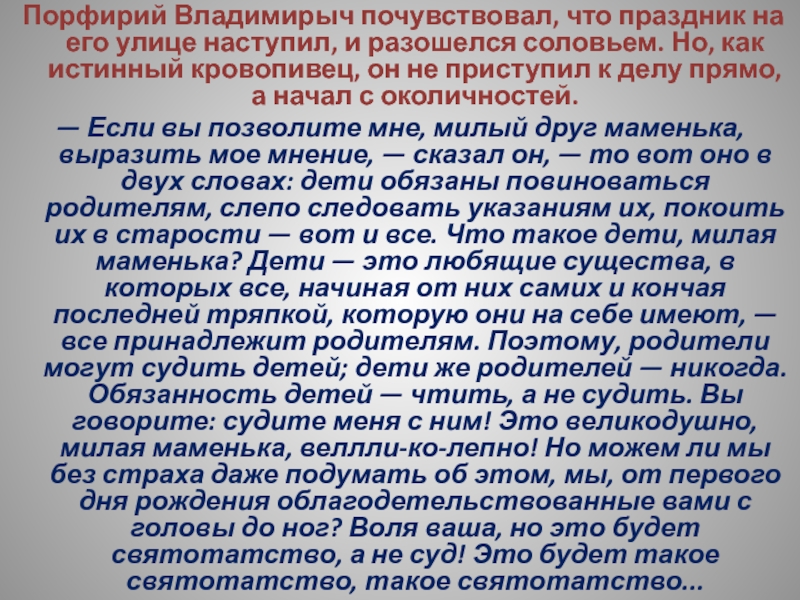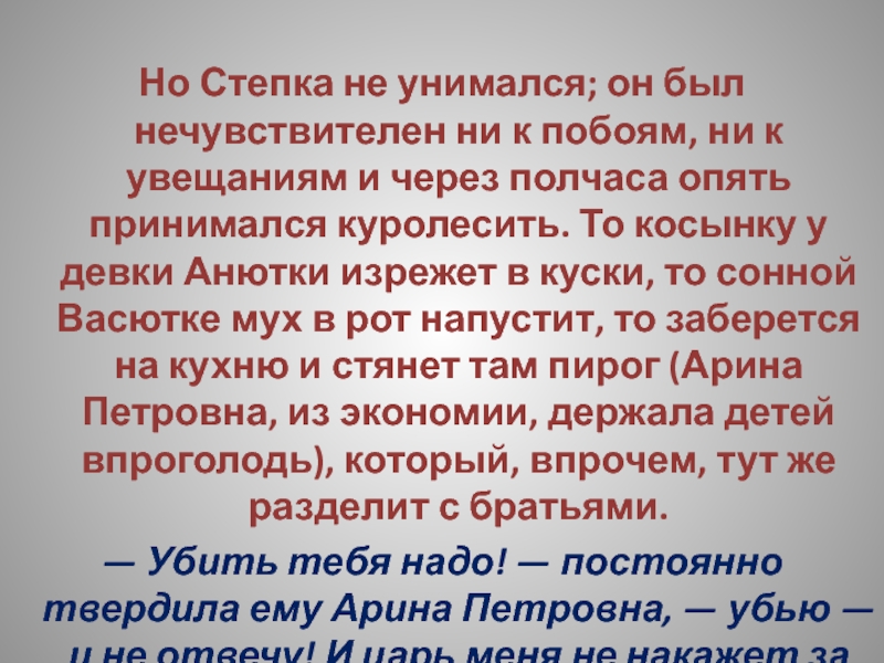 — Убить тебя надо! — постоянно твердила ему Арина Петровна, — убью — и не отвечу! И царь меня не накажет за это!