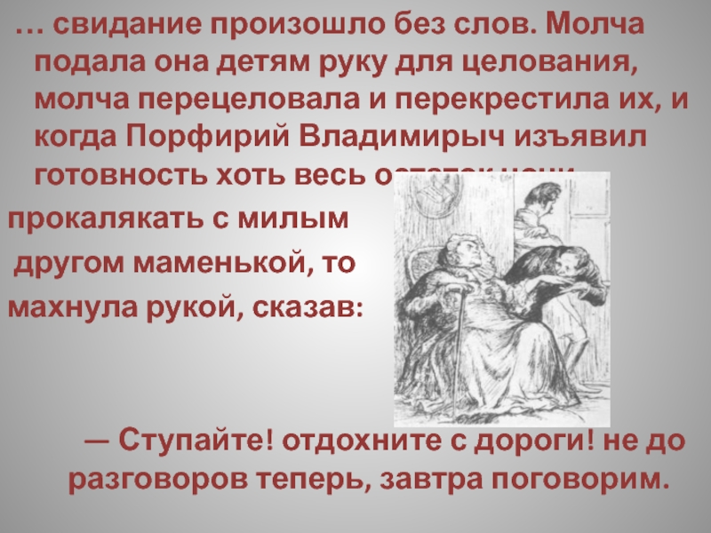 расчувствовался (Арина Петровна надеялась, что он ручку у ней поцелует) и не обнаружил раскаяния, но даже как будто ничего не слыхал.