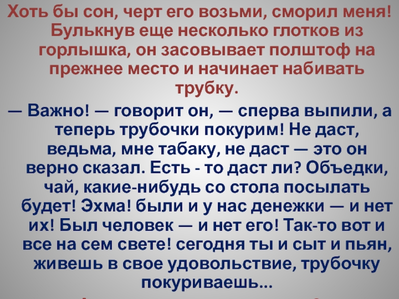 — Важно! — говорит он, — сперва выпили, а теперь трубочки покурим! Не даст, ведьма, мне табаку, не даст — это он верно сказал. Есть - то даст ли? Объедки, чай, какие-нибудь со стола посылать будет! Эхма! были и у нас денежки — и нет их! Был человек — и нет его! Так-то вот и все на сем свете! сегодня ты и сыт и пьян, живешь в свое удовольствие, трубочку покуриваешь...