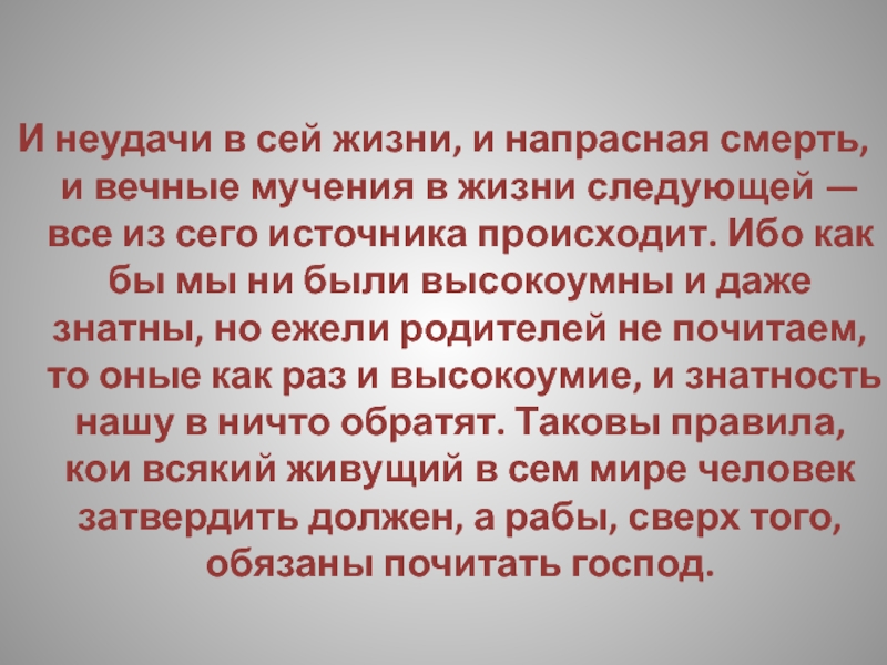 в жизни следующей — все из сего источника происходит. Ибо как бы мы ни были высокоумны и даже знатны, но ежели родителей не почитаем, то оные как раз и высокоумие, и знатность нашу в ничто обратят. Таковы правила, кои всякий живущий в сем мире человек затвердить должен, а рабы, сверх того, обязаны почитать господ.