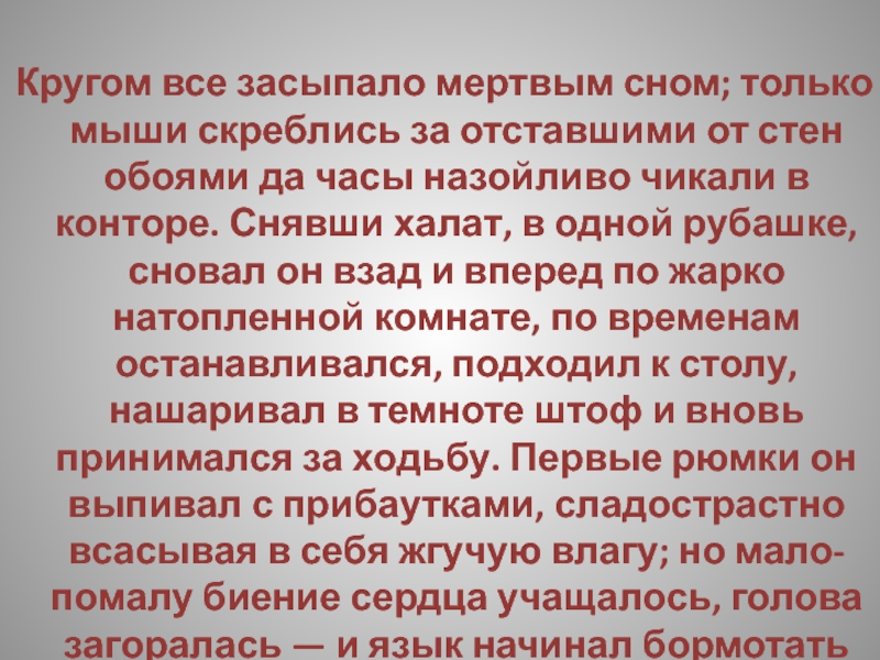 стен обоями да часы назойливо чикали в конторе. Снявши халат, в одной рубашке, сновал он взад и вперед по жарко натопленной комнате, по временам останавливался, подходил к столу, нашаривал в темноте штоф и вновь принимался за ходьбу. Первые рюмки он выпивал с прибаутками, сладострастно всасывая в себя жгучую влагу; но мало-помалу биение сердца учащалось, голова загоралась — и язык начинал бормотать что-то несвязное.