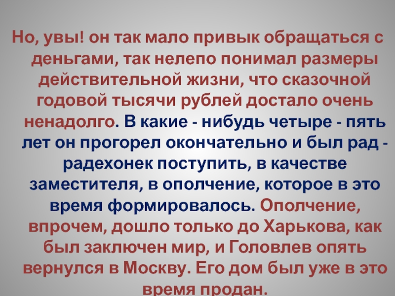 понимал размеры действительной жизни, что сказочной годовой тысячи рублей достало очень ненадолго. В какие - нибудь четыре - пять лет он прогорел окончательно и был рад - радехонек поступить, в качестве заместителя, в ополчение, которое в это время формировалось. Ополчение, впрочем, дошло только до Харькова, как был заключен мир, и Головлев опять вернулся в Москву. Его дом был уже в это время продан.