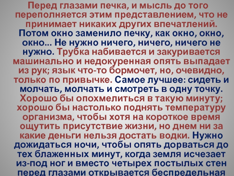 что не принимает никаких других впечатлений. Потом окно заменило печку, как окно, окно, окно... Не нужно ничего, ничего, ничего не нужно. Трубка набивается и закуривается машинально и недокуренная опять выпадает из рук; язык что-то бормочет, но, очевидно, только по привычке. Самое лучшее: сидеть и молчать, молчать и смотреть в одну точку. Хорошо бы опохмелиться в такую минуту; хорошо бы настолько поднять температуру организма, чтобы хотя на короткое время ощутить присутствие жизни, но днем ни за какие деньги нельзя достать водки. Нужно дожидаться ночи, чтобы опять дорваться до тех блаженных минут, когда земля исчезает из-под ног и вместо четырех постылых стен перед глазами открывается беспредельная светящаяся пустота.