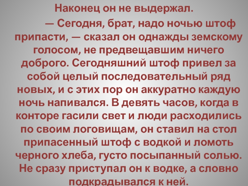 Сегодня, брат, надо ночью штоф припасти, — сказал он однажды земскому голосом, не предвещавшим ничего доброго. Сегодняшний штоф привел за собой целый последовательный ряд новых, и с этих пор он аккуратно каждую ночь напивался. В девять часов, когда в конторе гасили свет и люди расходились по своим логовищам, он ставил на стол припасенный штоф с водкой и ломоть черного хлеба, густо посыпанный солью. Не сразу приступал он к водке, а словно подкрадывался к ней.