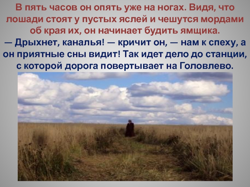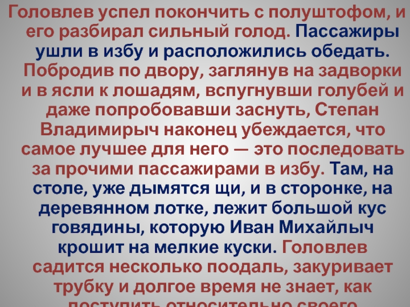 Слайд 54Головлев успел покончить с полуштофом, и его разбирал сильный голод. Пассажиры