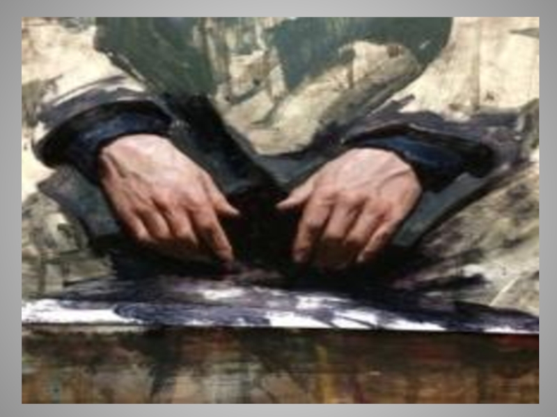 Слайд 36Смотрит он исподлобья, угрюмо, но эта угрюмость не выражает внутреннего недовольства,