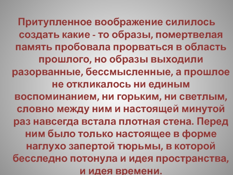 прорваться в область прошлого, но образы выходили разорванные, бессмысленные, а прошлое не откликалось ни единым воспоминанием, ни горьким, ни светлым, словно между ним и настоящей минутой раз навсегда встала плотная стена. Перед ним было только настоящее в форме наглухо запертой тюрьмы, в которой бесследно потонула и идея пространства, и идея времени.