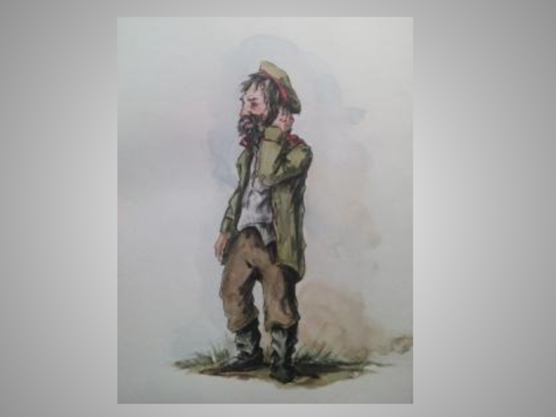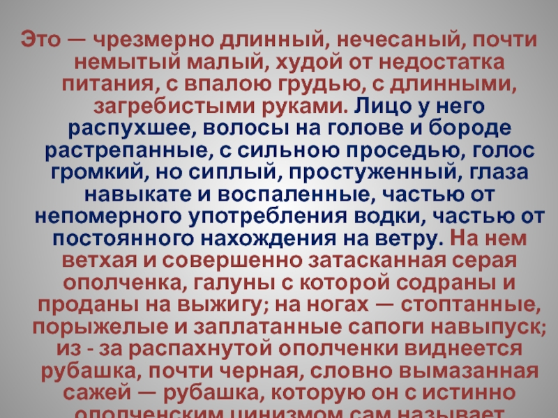 питания, с впалою грудью, с длинными, загребистыми руками. Лицо у него распухшее, волосы на голове и бороде растрепанные, с сильною проседью, голос громкий, но сиплый, простуженный, глаза навыкате и воспаленные, частью от непомерного употребления водки, частью от постоянного нахождения на ветру. На нем ветхая и совершенно затасканная серая ополченка, галуны с которой содраны и проданы на выжигу; на ногах — стоптанные, порыжелые и заплатанные сапоги навыпуск; из - за распахнутой ополченки виднеется рубашка, почти черная, словно вымазанная сажей — рубашка, которую он с истинно ополченским цинизмом сам называет «блошни́цею».