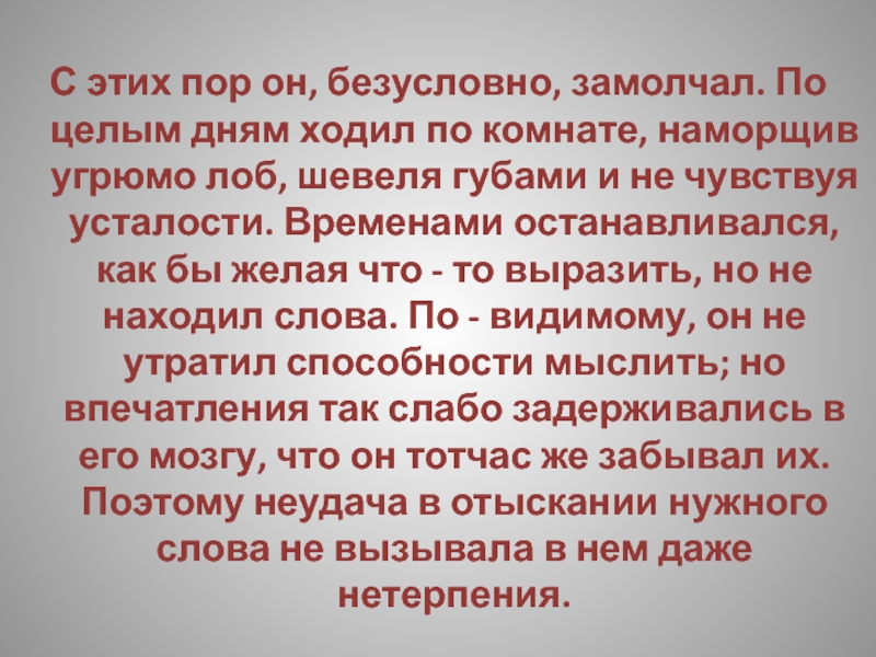 комнате, наморщив угрюмо лоб, шевеля губами и не чувствуя усталости. Временами останавливался, как бы желая что - то выразить, но не находил слова. По - видимому, он не утратил способности мыслить; но впечатления так слабо задерживались в его мозгу, что он тотчас же забывал их. Поэтому неудача в отыскании нужного слова не вызывала в нем даже нетерпения.