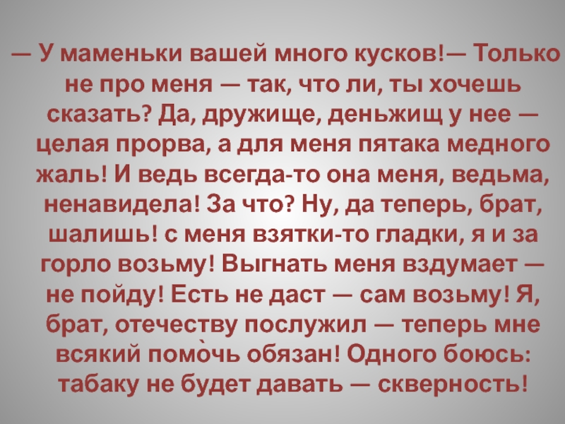 так, что ли, ты хочешь сказать? Да, дружище, деньжищ у нее — целая прорва, а для меня пятака медного жаль! И ведь всегда-то она меня, ведьма, ненавидела! За что? Ну, да теперь, брат, шалишь! с меня взятки-то гладки, я и за горло возьму! Выгнать меня вздумает — не пойду! Есть не даст — сам возьму! Я, брат, отечеству послужил — теперь мне всякий помо̀чь обязан! Одного боюсь: табаку не будет давать — скверность!