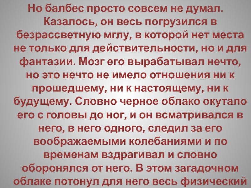 безрассветную мглу, в которой нет места не только для действительности, но и для фантазии. Мозг его вырабатывал нечто, но это нечто не имело отношения ни к прошедшему, ни к настоящему, ни к будущему. Словно черное облако окутало его с головы до ног, и он всматривался в него, в него одного, следил за его воображаемыми колебаниями и по временам вздрагивал и словно оборонялся от него. В этом загадочном облаке потонул для него весь физический и умственный мир...