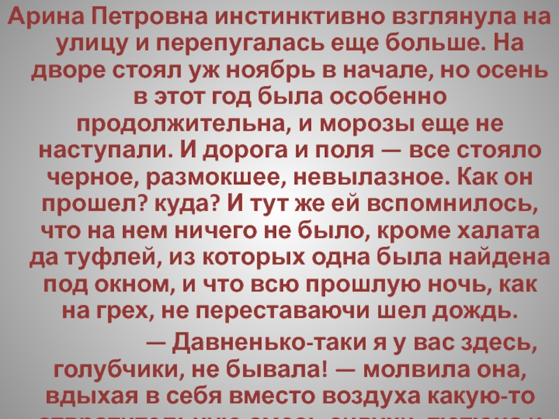 Слайд 200Арина Петровна инстинктивно взглянула на улицу и перепугалась еще больше. На