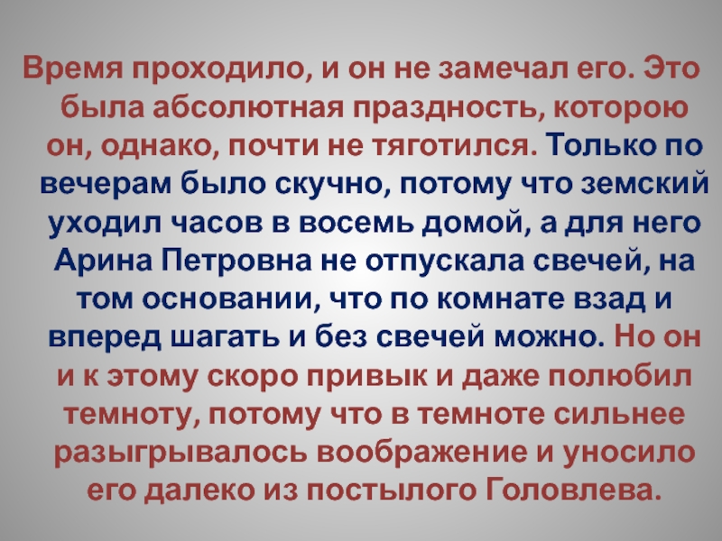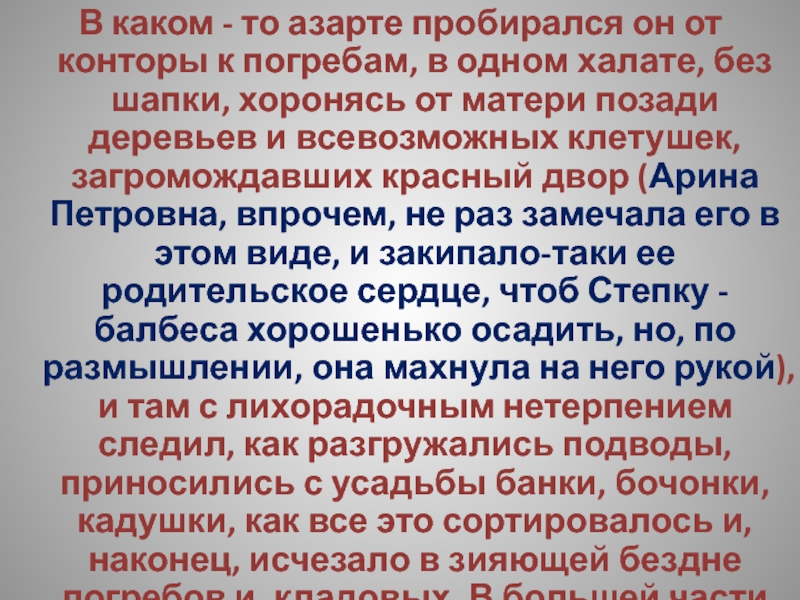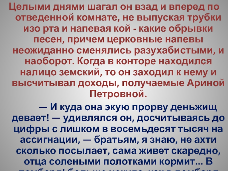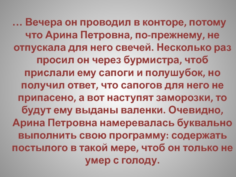 … Вечера он проводил в конторе, потому что Арина Петровна,