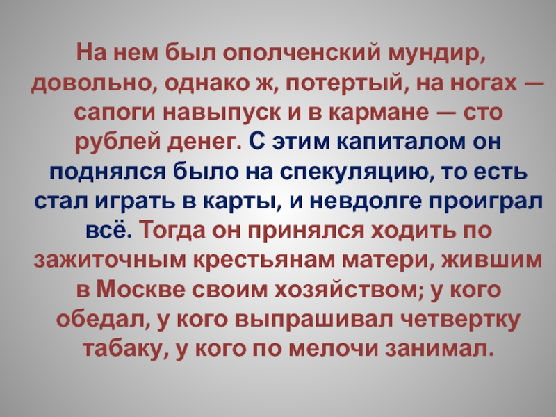 ногах — сапоги навыпуск и в кармане — сто рублей денег. С этим капиталом он поднялся было на спекуляцию, то есть стал играть в карты, и невдолге проиграл всё. Тогда он принялся ходить по зажиточным крестьянам матери, жившим в Москве своим хозяйством; у кого обедал, у кого выпрашивал четвертку табаку, у кого по мелочи занимал.