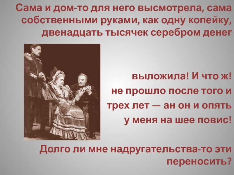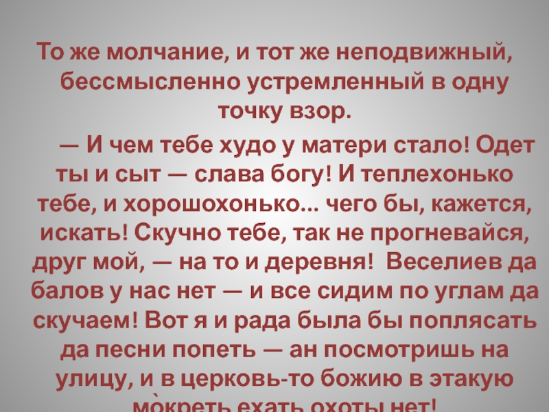— И чем тебе худо у матери стало! Одет ты и сыт — слава богу! И теплехонько тебе, и хорошохонько... чего бы, кажется, искать! Скучно тебе, так не прогневайся, друг мой, — на то и деревня! Веселиев да балов у нас нет — и все сидим по углам да скучаем! Вот я и рада была бы поплясать да песни попеть — ан посмотришь на улицу, и в церковь-то божию в этакую мо̀креть ехать охоты нет!