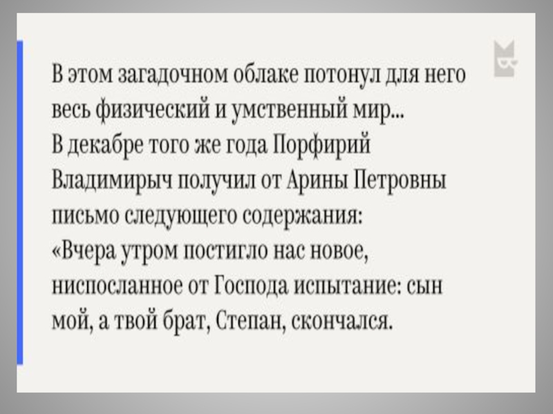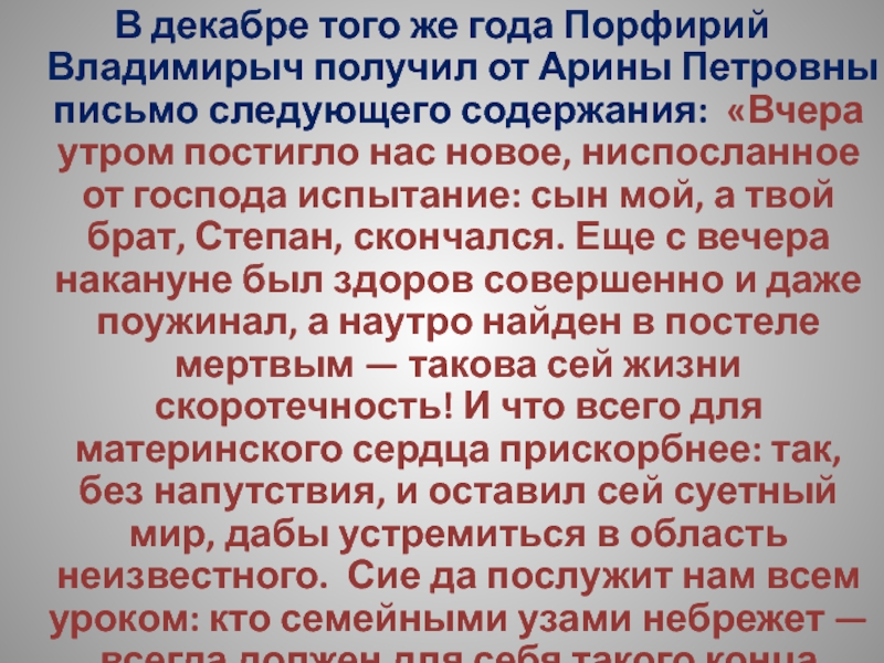Слайд 224В декабре того же года Порфирий Владимирыч получил от Арины Петровны