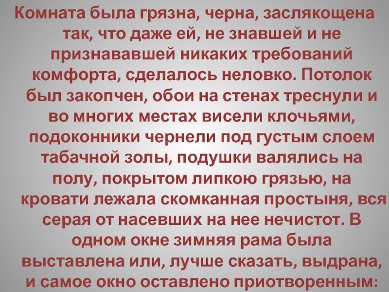 Слайд 198Комната была грязна, черна, заслякощена так, что даже ей, не знавшей