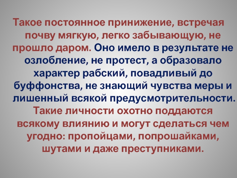 даром. Оно имело в результате не озлобление, не протест, а образовало характер рабский, повадливый до буффонства, не знающий чувства меры и лишенный всякой предусмотрительности. Такие личности охотно поддаются всякому влиянию и могут сделаться чем угодно: пропойцами, попрошайками, шутами и даже преступниками.