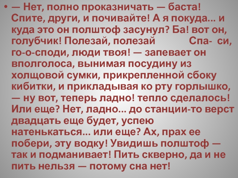 я покуда... и куда это он полштоф засунул? Ба! вот он, голубчик! Полезай, полезай Спа- си, го-о-споди, люди твоя! — запевает он вполголоса, вынимая посудину из холщовой сумки, прикрепленной сбоку кибитки, и прикладывая ко рту горлышко, — ну вот, теперь ладно! тепло сделалось! Или еще? Нет, ладно... до станции-то верст двадцать еще будет, успею натенькаться... или еще? Ах, прах ее побери, эту водку! Увидишь полштоф — так и подманивает! Пить скверно, да и не пить нельзя — потому сна нет!