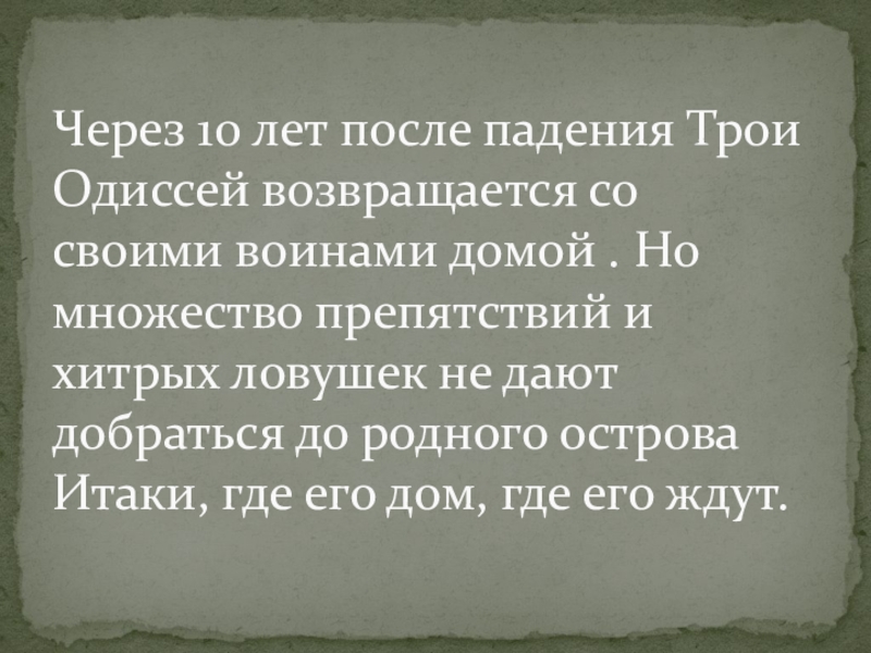 Слайд 4Через 10 лет после падения Трои Одиссей возвращается со своими воинами