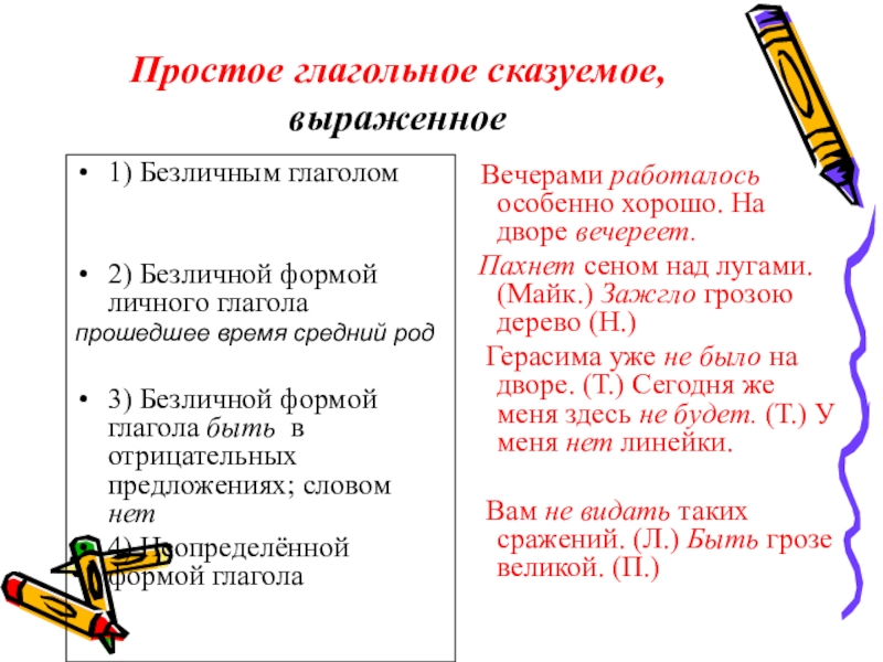 Пахнет сеном над лугами. (Майк.) Зажгло грозою дерево (Н.)