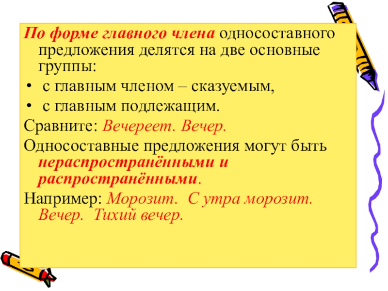 Слайд 3По форме главного члена односоставного предложения делятся на две основные группы:
