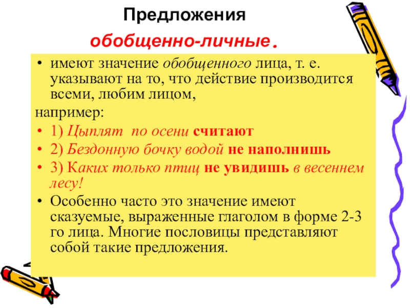 Особенно часто это значение имеют сказуемые, выраженные глаголом в форме 2-3 го лица. Многие пословицы представляют собой такие предложения.