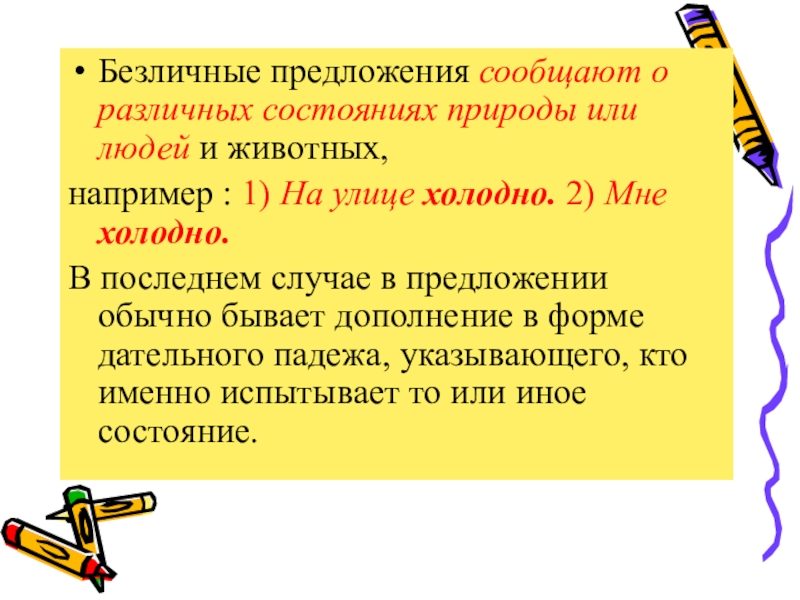 В последнем случае в предложении обычно бывает дополнение в форме дательного падежа, указывающего, кто именно испытывает то или иное состояние.